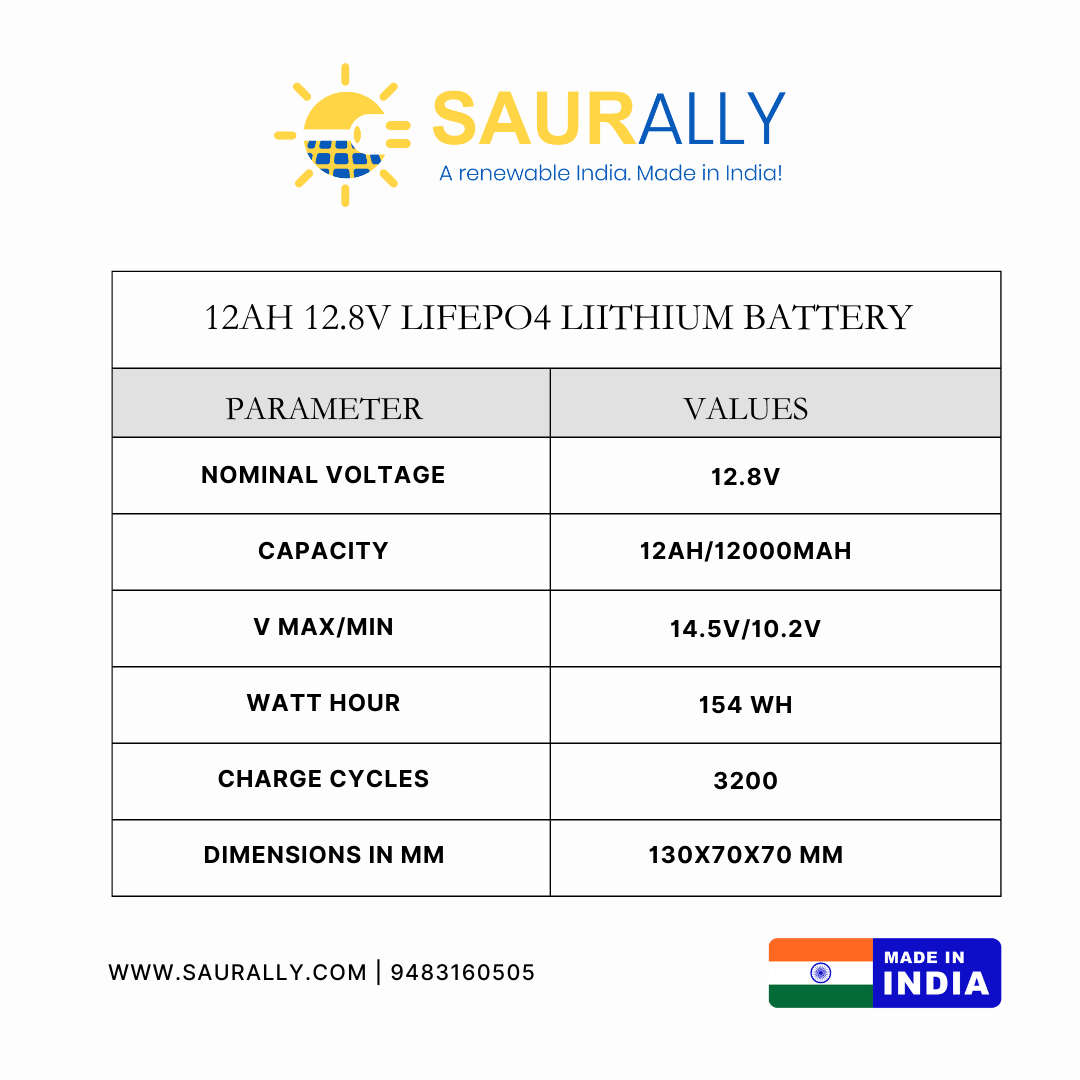 12Ah 12.8V Lithium Ferro Phosphate LiFePO4 Battery Pack With BMS is used in Agriculture Spray Pumps, Computer UPS, Solar Street Lights, Solar Cameras, Solar Homekits, Solar Lightinig, Solar Fencing Machine etc.