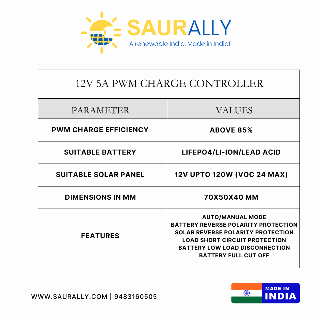 12V, 5A Solar PWM Solar Charge Controller With overcharge/discharge protection. Compatible with Lithium Battery, Lithium Phosphate Battery, LFP, LiFePO4, Lead Acid battery. Manual or Auto Dawn to Dusk Mode available with jumper pin (Switch)